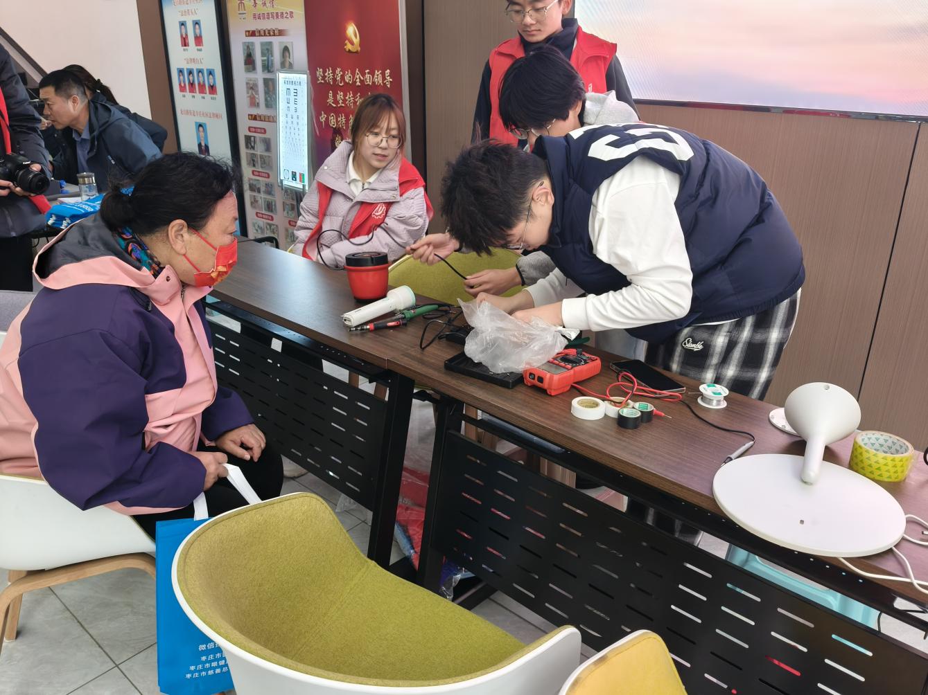 活动当天,志愿者们早早布置好服务摊位,拉起宣传横幅,整齐摆放各类维修工具,热情迎接前来咨询的社区居民。活动刚开始,便陆续有居民带着电风扇、电水壶、收音机等故障家电前来求助。志愿者们灵活运用课堂所学的专业知识,借助万用表、电烙铁等工具,认真检测、分析故障原因,细致进行维修。在维修间隙,志愿者们还主动向居民讲解家电使用注意事项和简单故障排查方法,手把手示范安全用电与日常保养技巧。这一贴心服务不仅为居民解决了实际困难、节省了开支,更将科学用电的知识传递到社区,赢得了居民的广泛称赞。