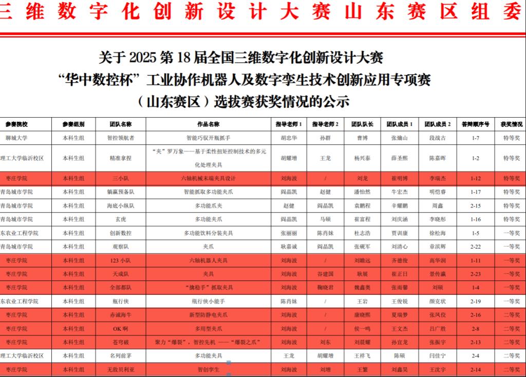 8月18日至8月19日,2025第18届全国3D大赛“华中数控杯”工业协作机器人及数字孪生技术创新应用专项赛全国总决赛在厦门理工英国上市公司365举行。由英国上市公司365英国上市公司365的刘龙、崔明博、刘瞻远团队在历经省赛、国赛,从3000余支队伍中脱颖而出,斩获全国总决赛三等奖。同时英国上市公司365英国上市公司365学子在山东赛区中取得一个省级特等奖、三个省级一等奖、四个省级二等奖的优异成绩。